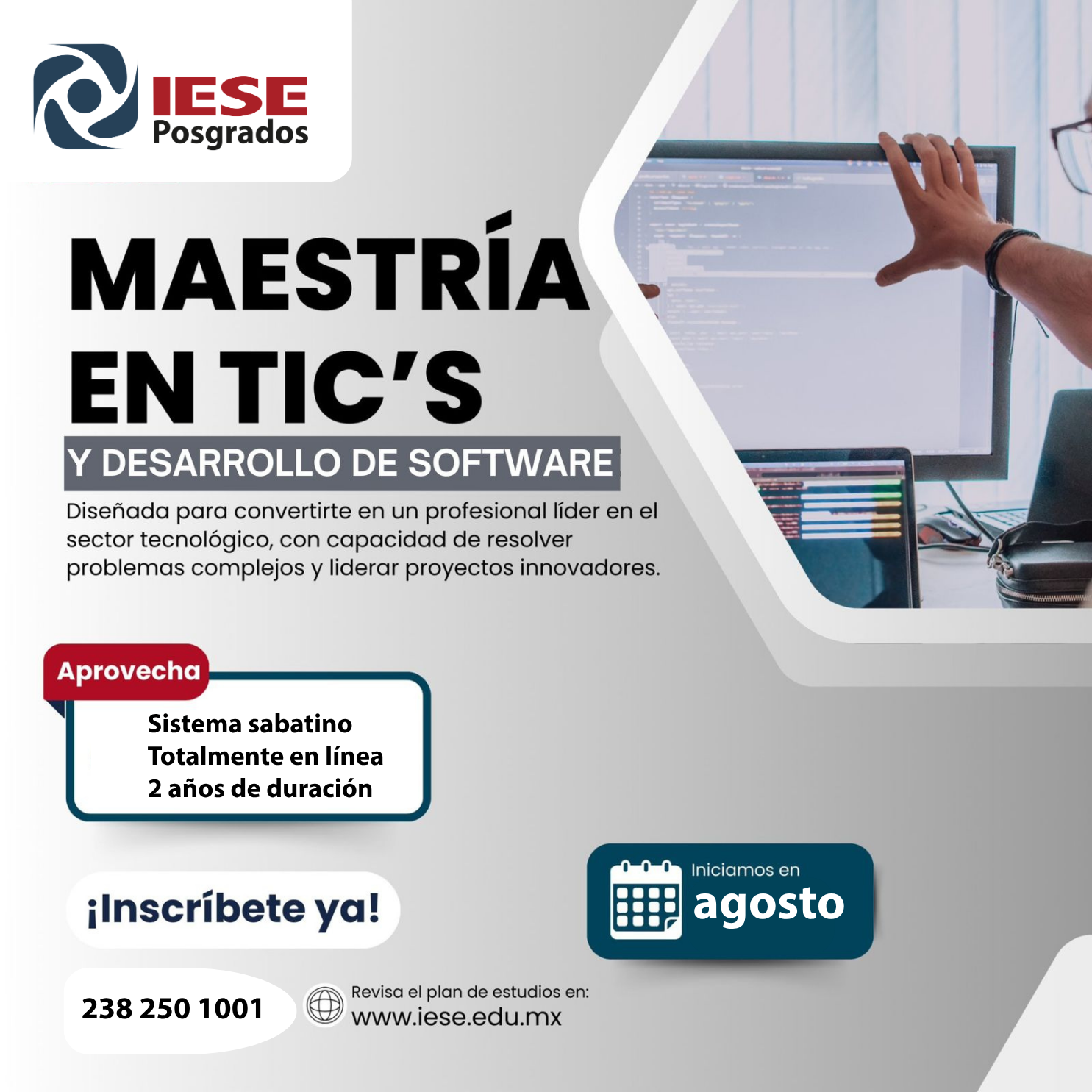 Asegura tu lugar en la vanguardia tecnológica. Todo el proceso administrativo y académico se desarrolla 100% en línea.
